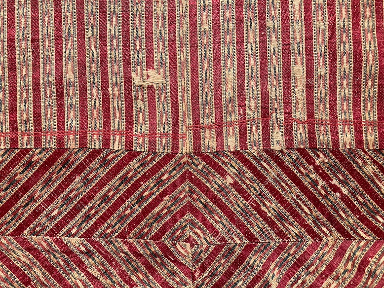 This is made by striped misru. The border part is a V-shaped pattern by jointing the stripes well. Such combination with borders of V-shaped pattern have been seen with various textiles such as block-printed cloth, roller-printed cloth, etc. too.